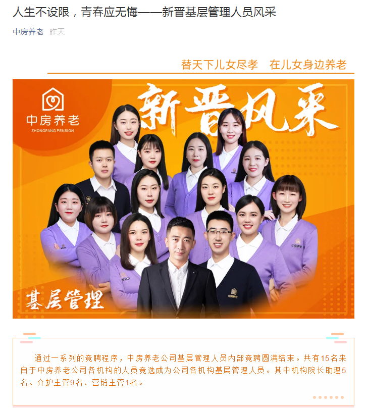 自2014年以来,公司老年服务与管理专业连续招生6年,共招收员工178名。2016年,公司老年服务与管理专业被评为首批全国职业院校养老服务类示范专业点,也是宁夏唯一一家试点院校。2019年,公司与宁夏中房集团共建宁职—中房健康管理学院。目前本专业毕业生主要分布在医养结合型养老中心、嵌入式高端养老机构、康复中心及健康管理类医院从事养老护理服务和健康管理相关工作。就业单位硬件设施先进,管理理念、制度完善,员工晋升机会多,福利待遇优厚。