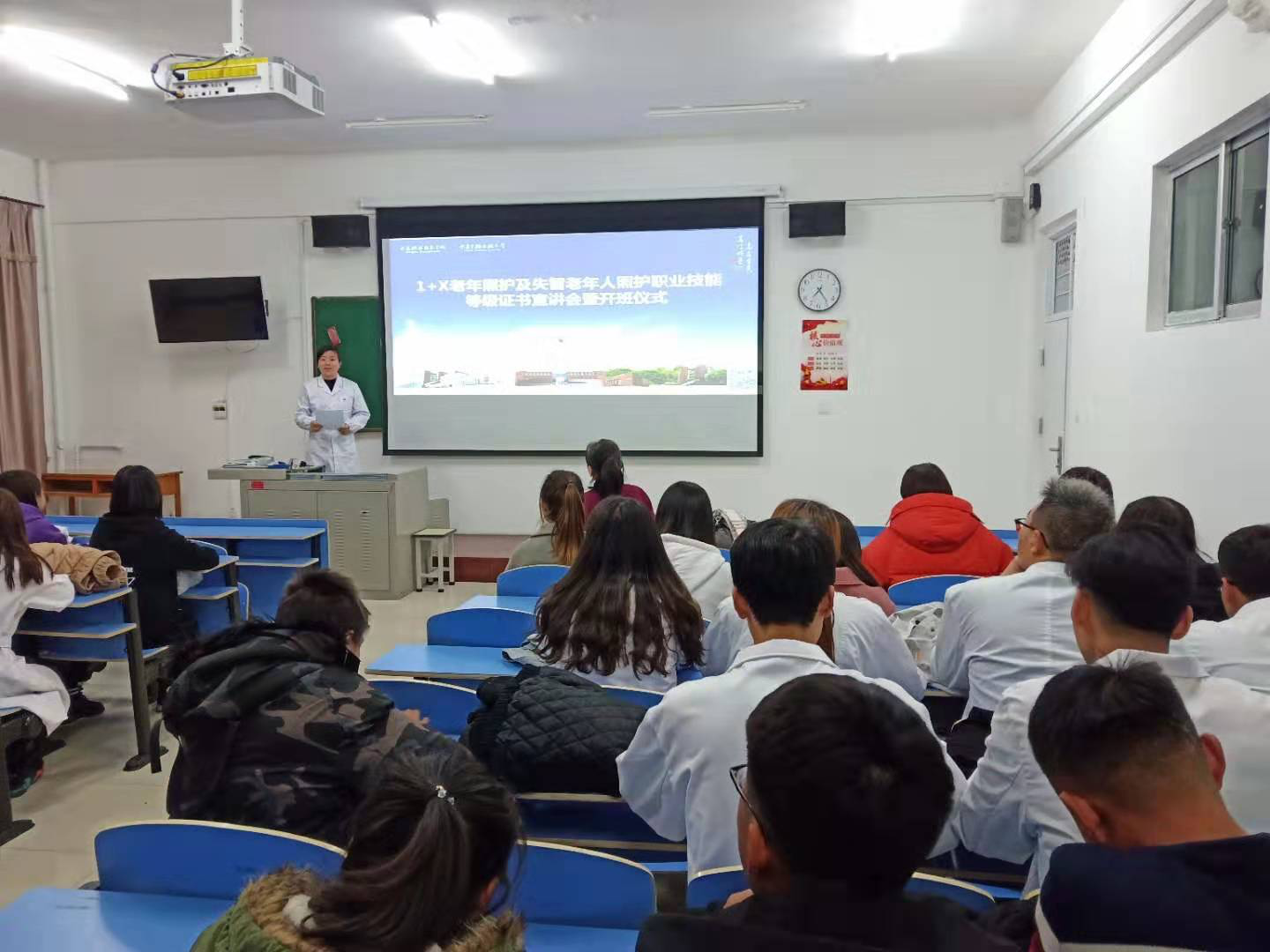 为了积极推进职业教育改革、加快养老服务领域职业教育现代化进程,促进技术技能人才培养培训模式和评价模式,进一步提升人才培养质量。公司健康管理与社会服务系于11月19日在竞智楼B412举行了1+X老年照护及失智老年人照护职业技能等级证书宣讲会暨开班仪式。参加开班仪式的有系副主任左莹、系部专业教师及2017级、2018级参训员工。