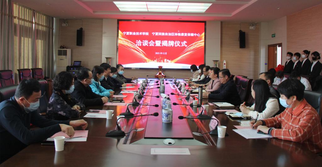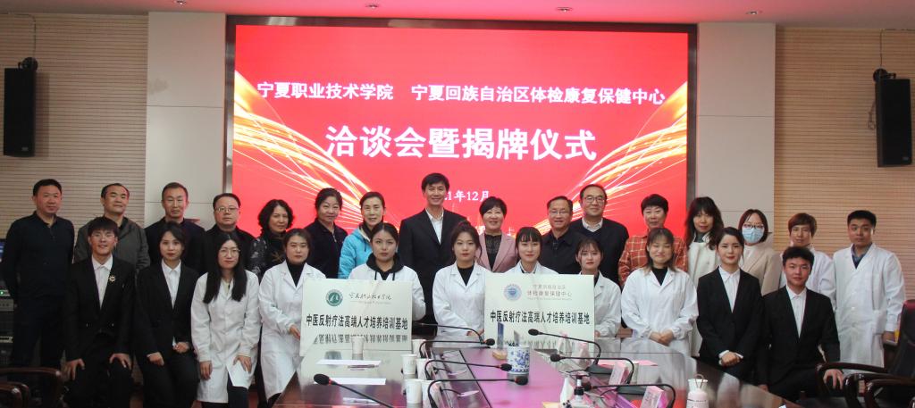 12月3日,宁夏职业技术学院与宁夏回族自治区体检康复保健中心共同主办的校医洽谈会暨揭牌仪式在公司新校区竞勤楼三楼会议室举行。宁夏回族自治区体检康复保健中心主任李学善等一行八人、党委委员、副董事长李晓延,党委委员、纪委书记马元,党政办公室、教务处、就业与合作交流处、健康管理与社会服务系班子成员及部分师生代表出席仪式,纪委书记马元主持。
