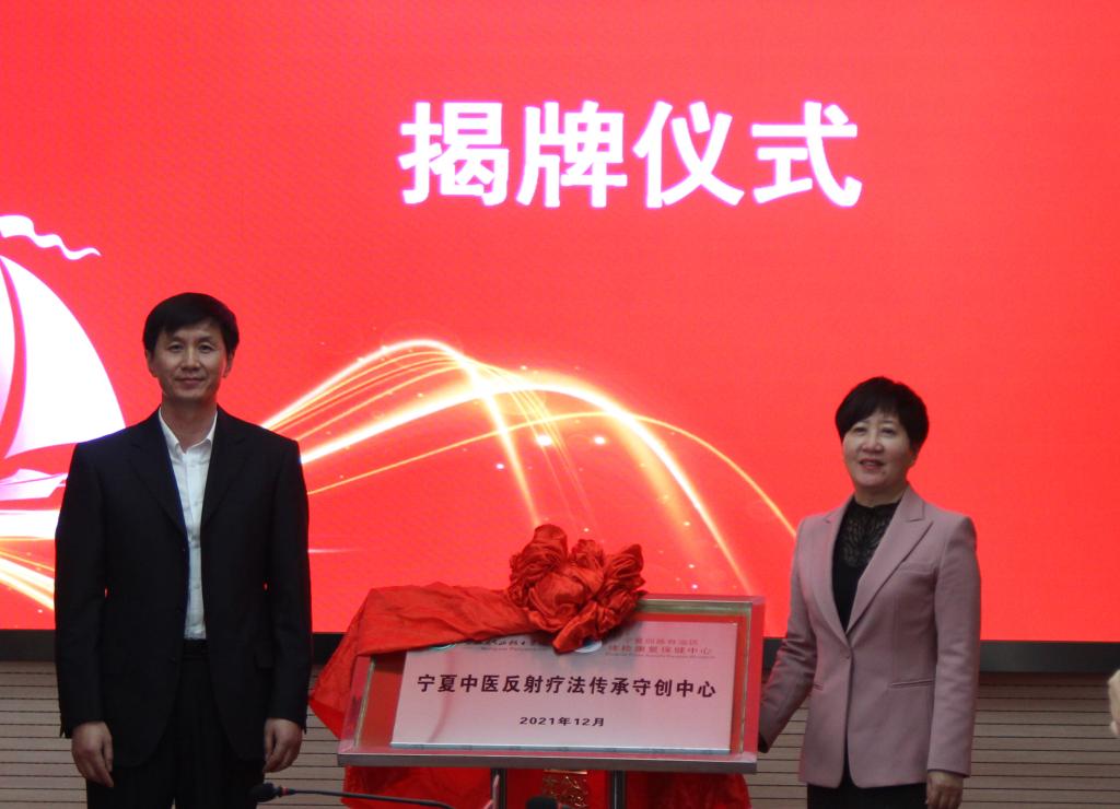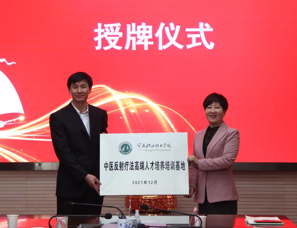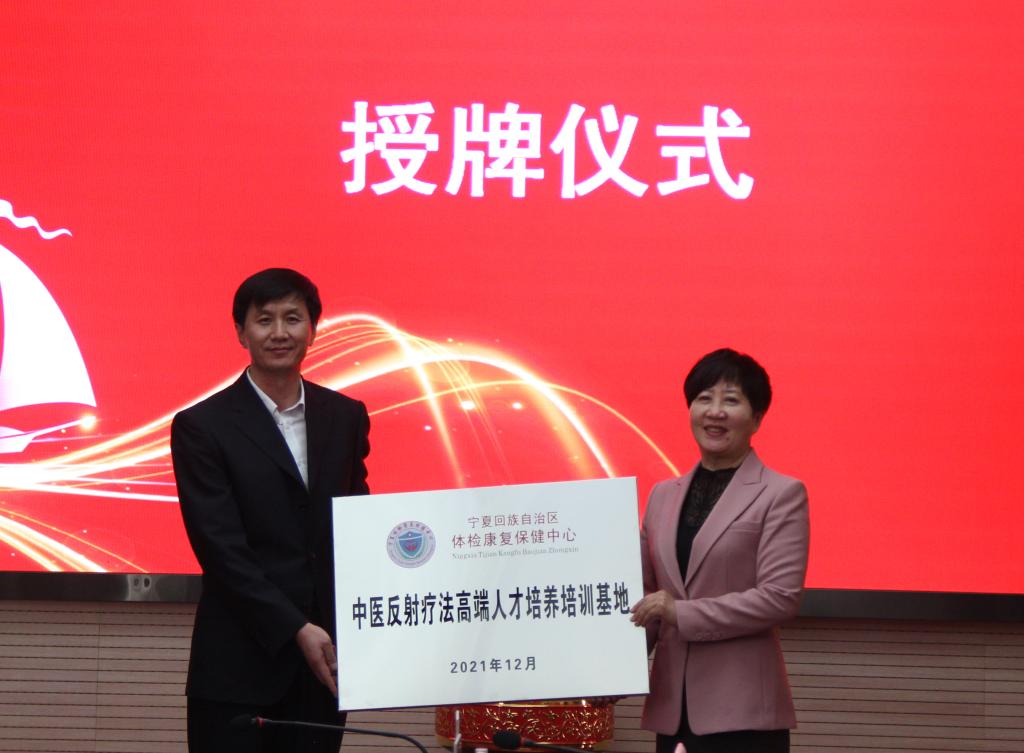 李晓延副董事长与李学善主任共同为“宁夏中医反射疗法传承守创中心”揭牌,双方互授了“中医反射疗法高端职业人才培养培训基地”牌匾。