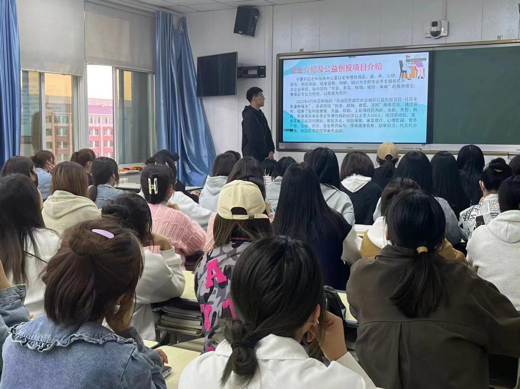 汇报活动中,7位员工代表分别分享了在宁夏邦尼老年服务中心、金凤养老院、兴庆中心敬老院、灸合堂养生馆、宁夏归德林养老服务中心、石嘴山中心医院和天津椿萱茂的实践教学学习内容、收获与感悟。