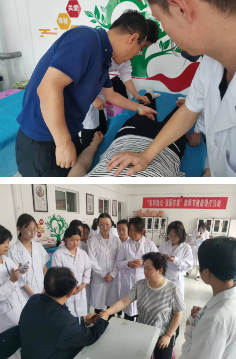 在竞新楼C306实训室内,陈岩副经理对同学的推拿手法进行了现场指导。名誉教授马东华运用全息速诊技术为患有肩周炎、腰椎间盘突出症、上呼吸道感染的老师们进行了诊疗。在学办辅导员老师的精心组织下,健康管理教研室李红等老师带领员工志愿者根据前来体验者的身体情况及不同需求,分别进行了颈、肩、腰、腿等部位的推拿按摩。