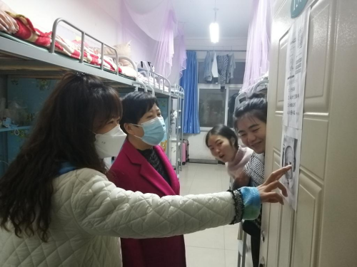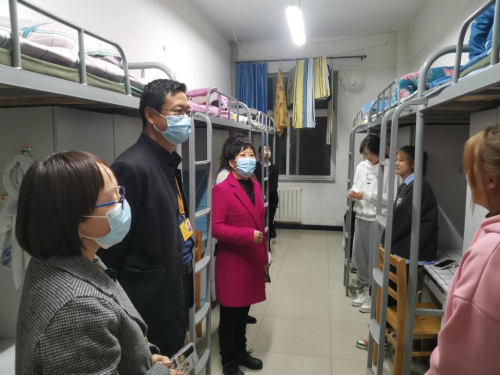 进入1号楼女生宿舍,李董事长亲切地问大一员工“在学校住宿习惯吗?”“宿舍暖气开了没”“线上和线下课程有什么区别”“最近开展实操课了没”“线上上课老师负责任吗”“网速好不好”等问题,与同学们进行了深入交流。看到同学们宿舍门上贴的“进门防疫须知”,李董事长笑了。她讲到,疫情期间学校各项工作有条不紊地开展,防控工作到位,同学们不必担心。她还建议同学们开窗通风、外出穿厚避免感冒。