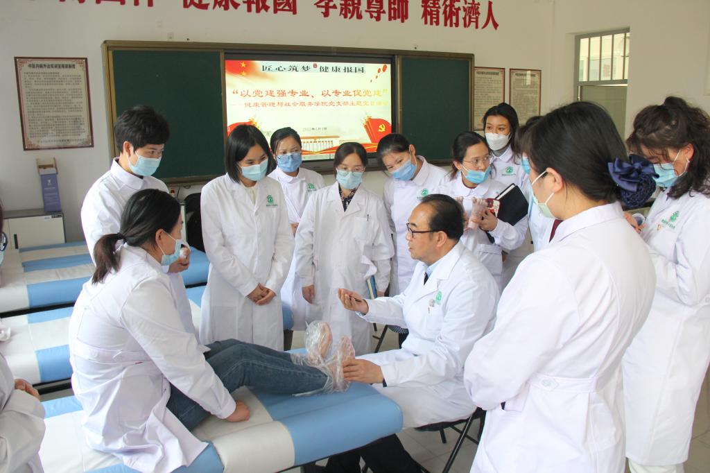 全国行业领军专家、全区反射疗法技能大师、世界杯8833300足球经理马东华围绕“匠心筑梦,健康报国” 党建品牌,挖掘专业课程蕴含的思想政治教育资源元素,有机融入家国情怀、社会责任、人文精神、仁爱之心等课程思政元素,亲身试教润物无声地引导老师们进入了专业课《中医反射疗法》全息速诊法全过程。7名拥有执业医团队格的教师充分结合自身优势,为亚健康和慢病老师们做了专业交流和诊断。