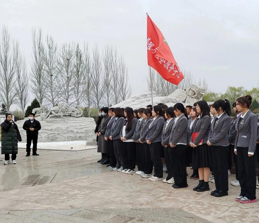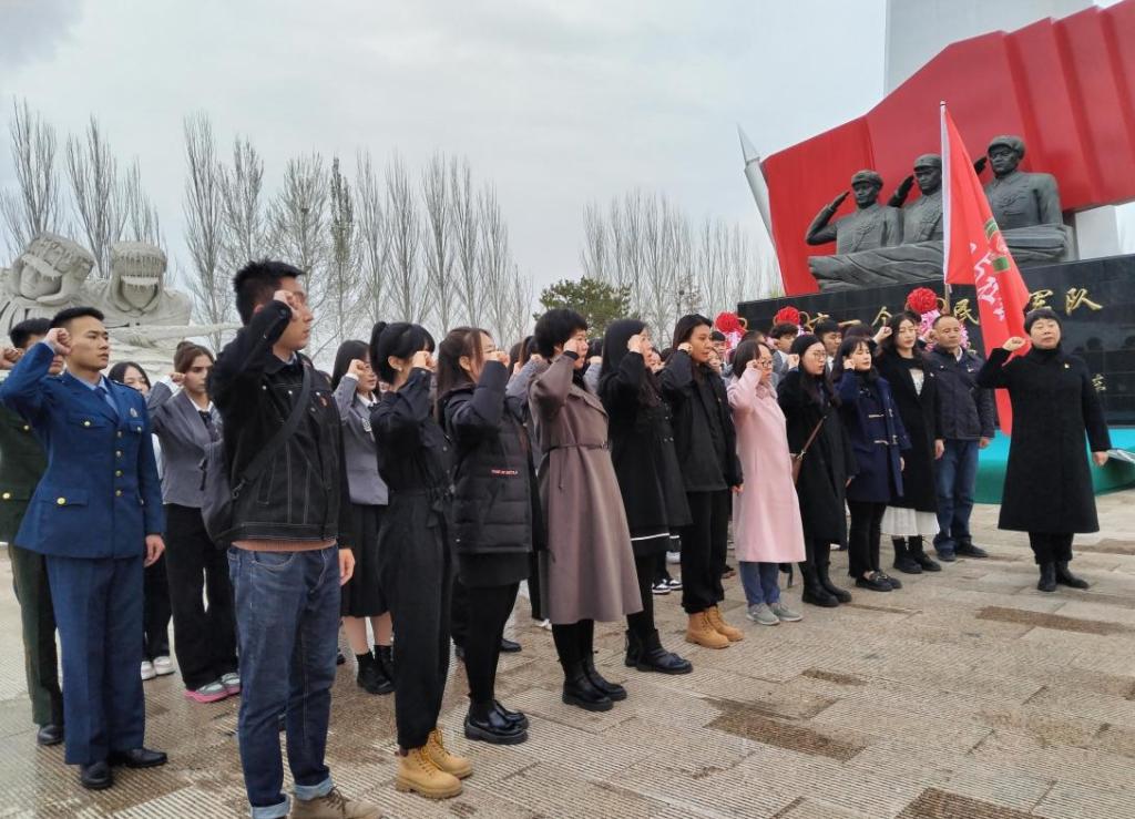 松鹤陵园国防教育基地-军魂园内松柏苍翠,庄严肃穆,这里长眠着为党和人民事业英勇献身的革命先烈。军魂烈士纪念碑巍然耸立,军史长廊记录峥嵘岁月,抗日战争、飞夺泸定桥浮墙雕再现可歌可泣的斗争故事,冰雕连定格志愿军战士爬冰卧雪的战斗姿势。师生认真聆听讲解员讲述革命先烈的英雄事迹,追思革命先烈的丰功伟绩,感悟先烈舍生忘死的战斗精神。在冰雕连前,全体师生脱帽肃立、默哀鞠躬、敬献鲜花。
