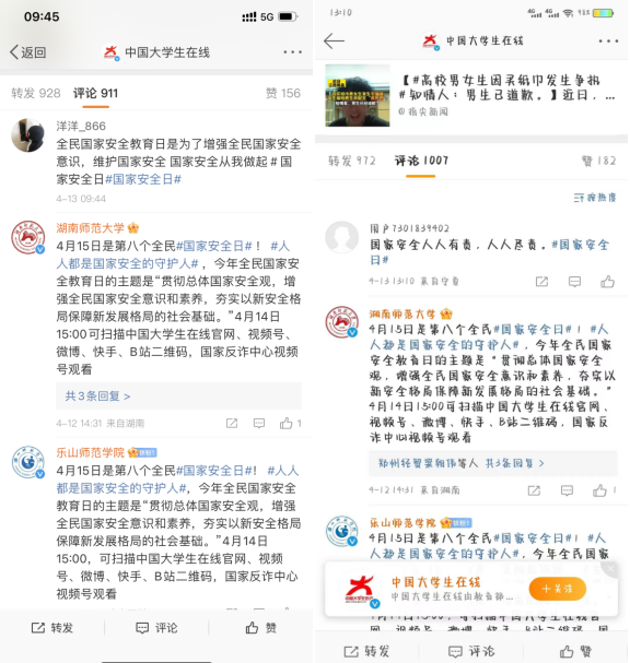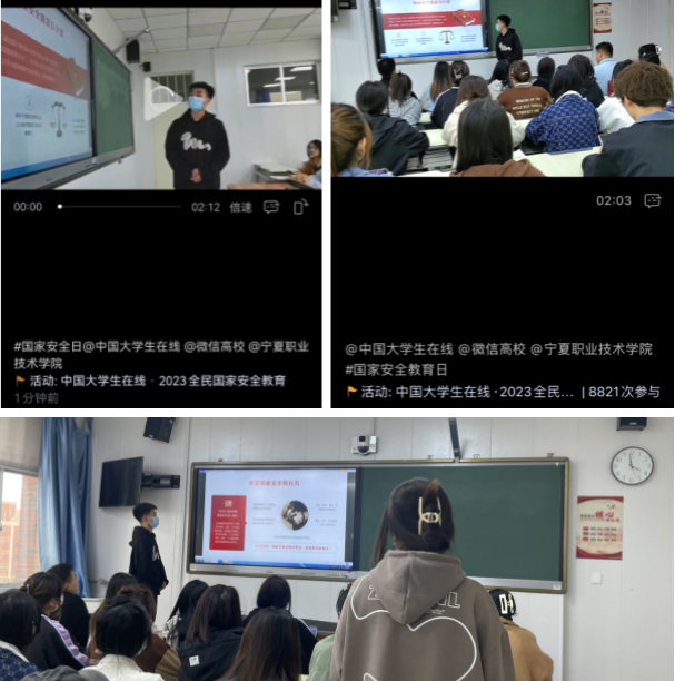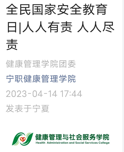 为了让同学们了解更多国家安全的相关知识,增强国家安全意识,学院通过“宁职健康管理公司”新媒体平台推送“全民国家安全教育日-人人有责 人人尽责”推文,组织同学们召开主题安全教育班会、通过微博参与“国家安全日话题互动”,通过微信视频号开展2023国家安全教育并组织国家安全知识问答,营造了浓厚的学习氛围。