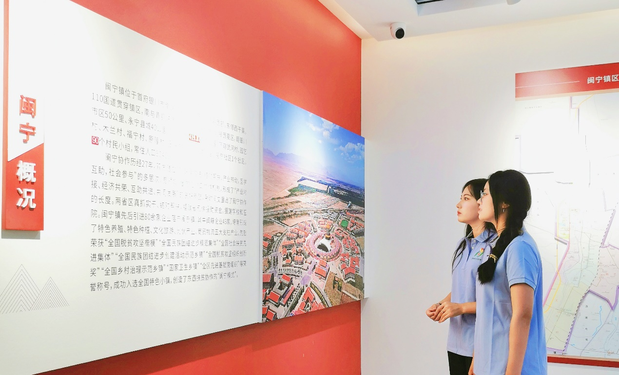 “星火相筑”发展成就观察团首站来到了闽宁镇镇史馆,在讲解员的带领下,回顾闽宁镇移民搬迁、艰苦创业的艰辛历程,沿着习近平总书记在宁夏的足迹,感受“闽宁协作”的力量和东西部扶贫协作重大战略意义。通过了解闽宁镇的特色种植产业、养殖产业、光伏产业、文化旅游产业、葡萄酒产业等,进一步感受了新发展阶段闽宁镇在特色产业、居住环境、乡风文明等方面的发展变化。