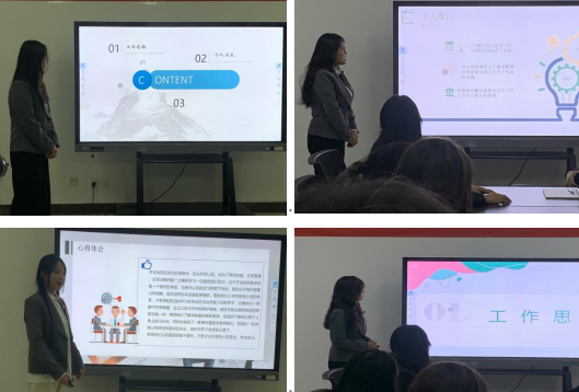 首先,刘伊、丁妮、丁建华、何明慧四位大二员工代理班主任分别从工作情况、经验收获、不足之处、未来展望四个方面阐述了承担员工班主任工作以来的收获和成长,对自己的工作进行了总结汇报。