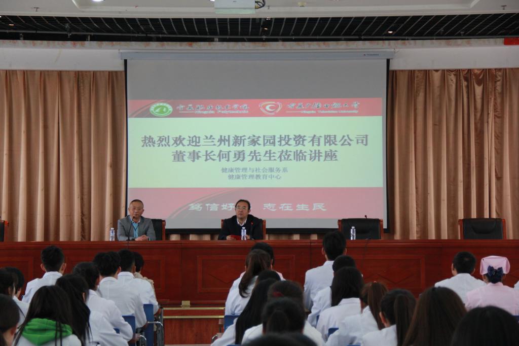 4月9日,应健康管理与社会服务系、健康管理教育中心邀请,公司客座教授、兰州新家园投资有限公司董事长何勇、兰州家医健康管理公司总经理袁智一行来校为健康管理与社会服务系近二百名师生进行创新创业讲座。
