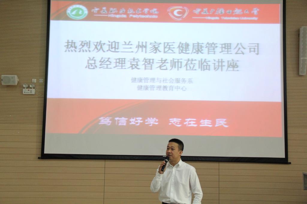 兰州家医健康管理公司总经理袁智老师通过创业实践经历,分享了适应社会环境、制定工作目标,选择方向信念不动摇和毕业后目标选择等内容,希望同学们坚定信心、把根扎稳,苦练技能为成功做好积淀。