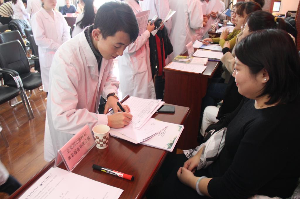 本次双选会邀请到自治区第五人民医院、北京同仁堂粹和养老服务有限公司、宁夏中房养老产业发展有限公司等23家省内外优秀的医院、养老康复机构、健康管理机构,这些企事业用人单位提供了10类260多个实习就业岗位。活动现场,同学们身着专业服装,主动与招聘人员交谈,了解用人单位情况,信心满满的递交简历。