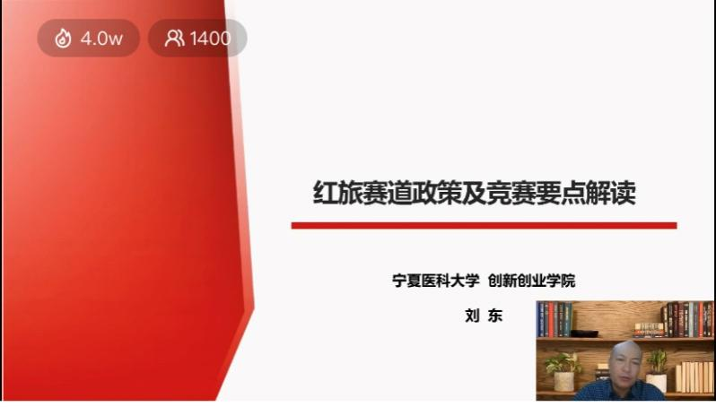 本次讲座特邀宁夏医科大学人才招聘处处长、创新创业学院经理刘东教授对红旅赛道政策及竞赛要点进行解读。刘东教授从红旅起源与概况讲起,分别就参赛要求、参赛条件、参赛项目来源、评审维度、参赛项目打造升级路径等方面进行详细论述。