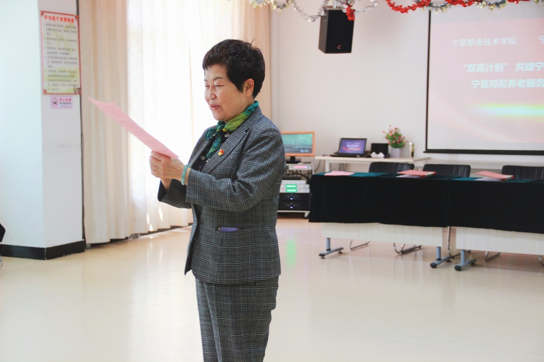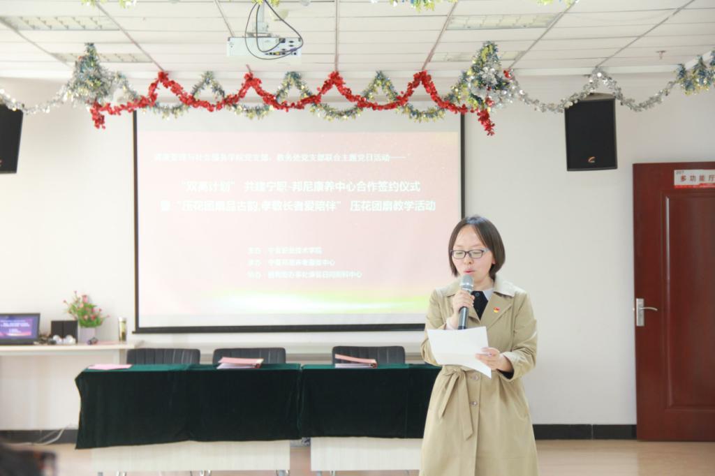 宁夏邦尼养老服务中心吴玉霞经理致辞。吴经理介绍了宁职、邦尼建立校企合作以来,共同承担教学、实习、顶岗见习、国家、区、市、院校技能大赛选手培养,促进了学院创新型教学团队队伍建设。后续将进一步打造我区产、教、研深度融合,康养人才培养共同体,以共建“双高计划”建设项目宁职-邦尼康养中心、养老驿站为新契机,开展医、康、养行业高水平人才培养标准制定、园艺康养等创新技术研究、引领康养标准科研成果转化,为自治区养老行业标准化、规范化、专业化发展贡献双方的共同力量。