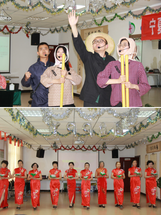 公司员工为长者表演话剧:《王有德防沙治沙感人事迹——幸福生活是奋斗出来的!》。用真诚的陪伴与互动为长者阿姨们送上母亲节、护士节的节日祝福。康馨社区老年模特队长者阿姨们为长者组织《好一朵茉莉花》走秀表演,展示了长者们老有所乐的风采。