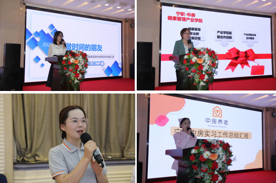 会上,宁夏中房养老产业发展有限公司总经理助理白洁做了题为“做时间的朋友”暨产业学院成立两周年成果汇报;健康管理与社会服务系副主任左莹从健康管理专业群发展历程、产业学院前期合作回顾和产业学院未来合作期待三个方面做了汇报;中房冠名班员工代表梁雪璐作了实习工作总结汇报。