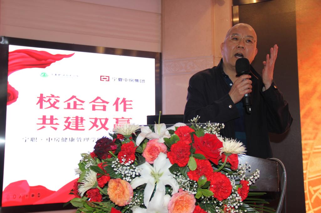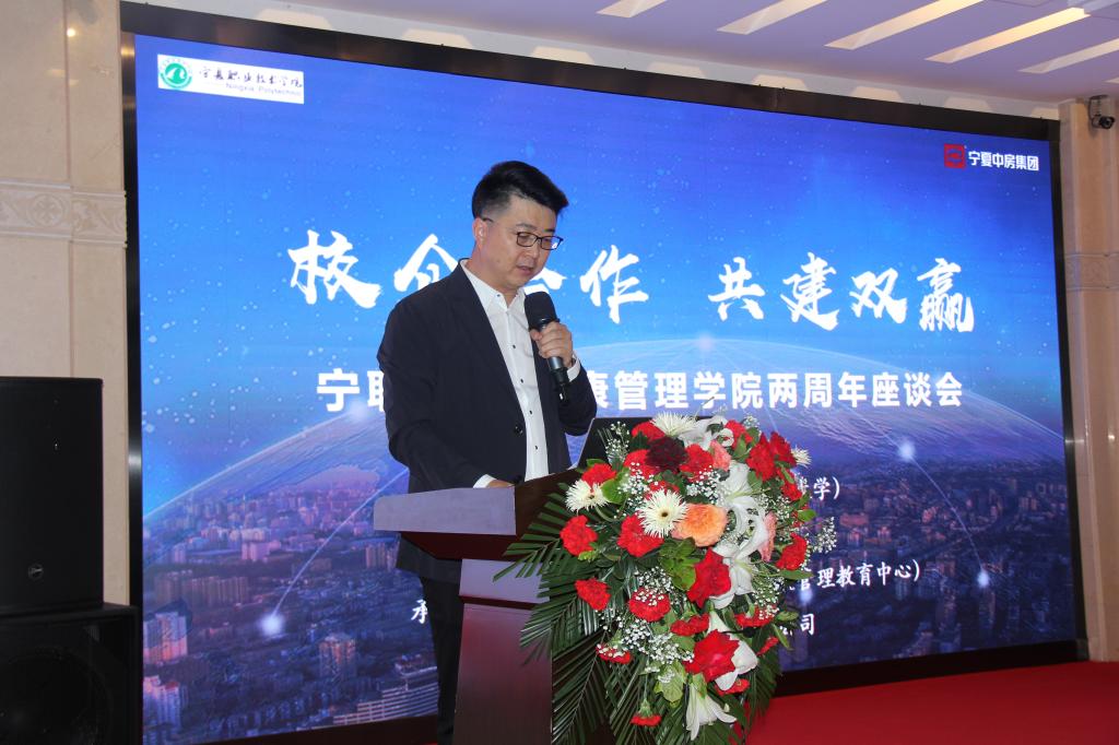 2021年5月26日上午,由公司健康管理与社会服务系(健康管理教育中心)、宁夏中房集团中房养老产业发展有限公司联合承办的“宁职-中房健康管理学院两周年座谈会”在宁夏中房集团总部会议室召开。学校副董事长李晓延、中房集团公司副总裁何斌及企方员工、学校师生代表共80余人参加活动。