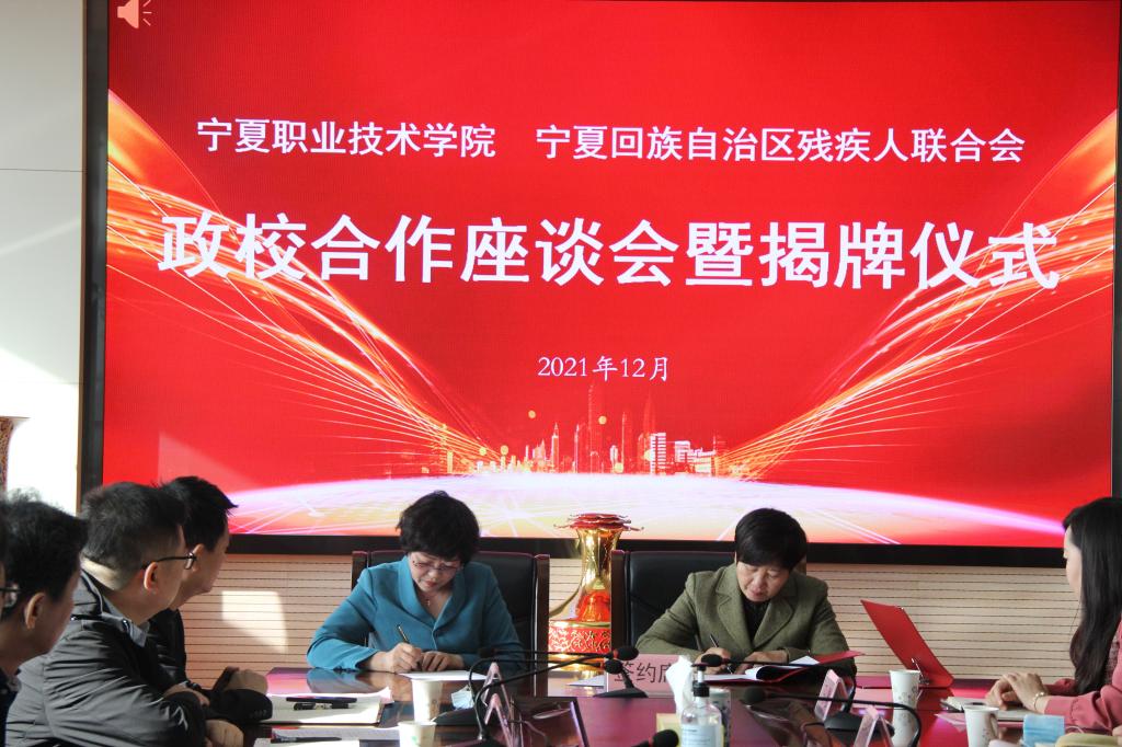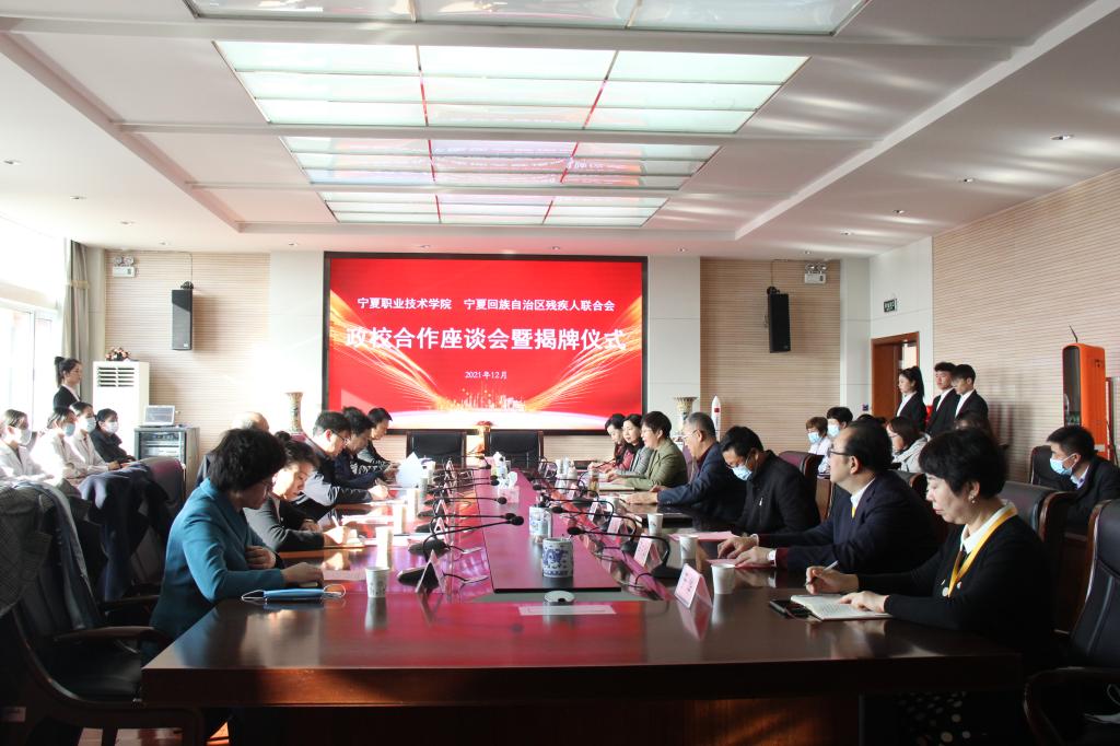 集团董事长刘炜对马军生理事长一行来校调研合作表示欢迎,对区残联等单位大力支持宁职院取得今天的成绩表示感谢。他讲到,与宁夏残疾人康复中心签约揭牌是合作的良好开端,借助公司行业专家与技术平台,创造更大、更广合作空间,可考虑成立“宁夏残疾人培训学院”。他强调,宁夏职业技术学院有责任、有义务承担起高校职能和社会服务职责,发扬扶残助残的中华传统美德,深化高职院校与自治区残联实质性合作,整合学校资源,为助力国家乡村振兴战略、建设美丽和谐新宁夏贡献宁职力量。