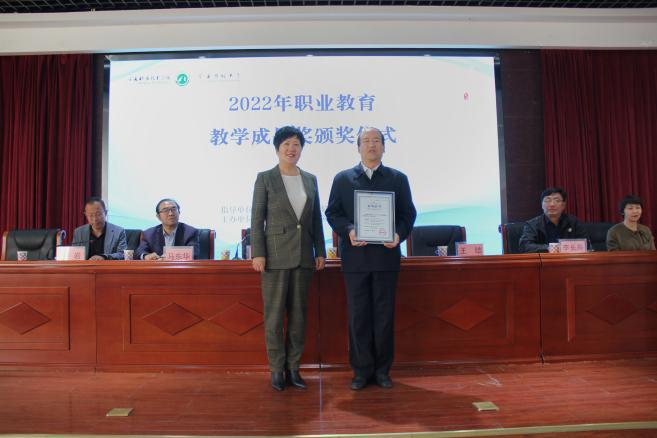 李晓延副董事长为获奖教师代表王结主任颁发2022年职业公司产品成果二等奖获奖证书。