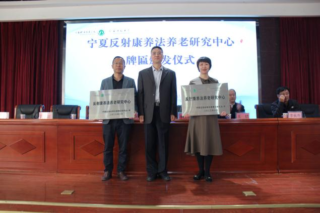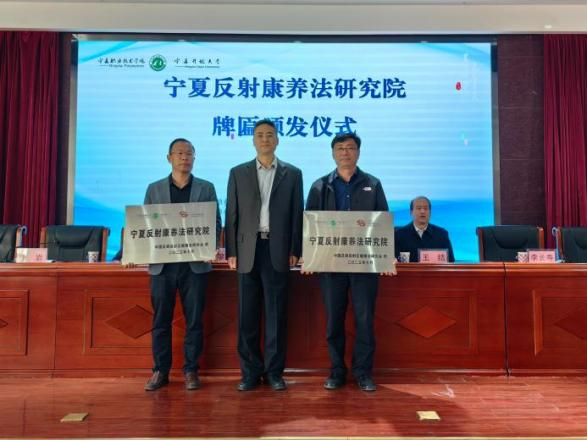 开幕式后,廖海涛会长为宁夏反射康养法研究院颁发牌匾,陈岩副经理代表宁夏职业技术学院、李长寿主任代表宁夏中医研究院上台接受牌匾;