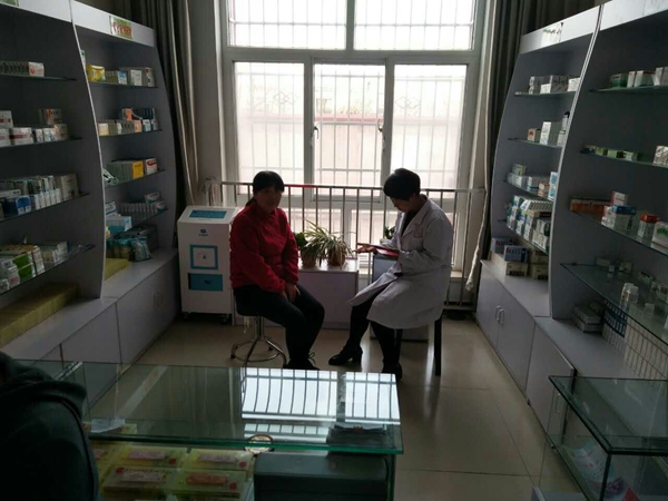 活动中,同学们帮老人测量血压、血糖,袁枫老师用先进的AMP无创血液分析仪熟练的为老人做健康检测,王雪妮老师利用自己丰富的临床经验解读AMP检测报告,为患者认真耐心地说明身体状况,提醒他们对某些身体信号的预防并指导他们用药。部分同学在康复理疗室为老人进行健康干预服务。