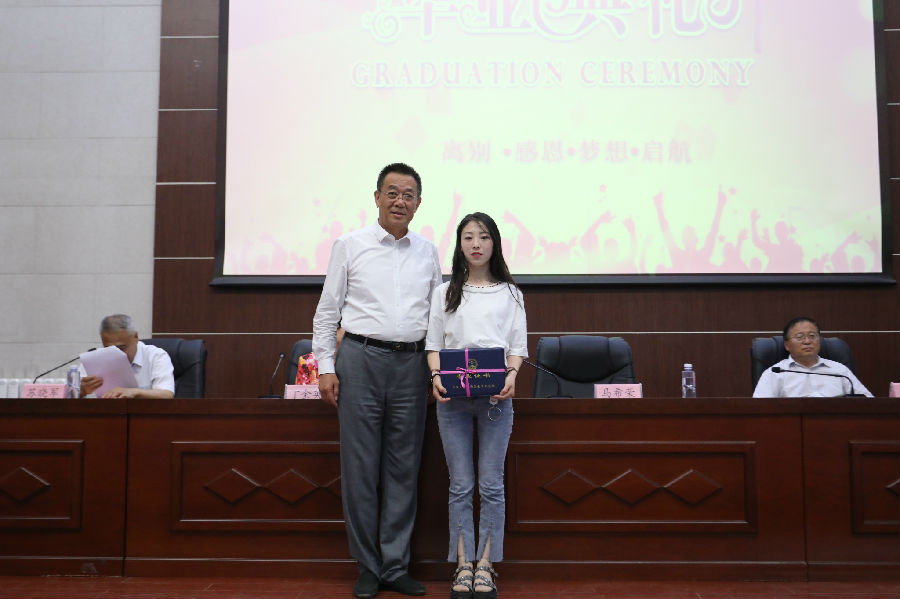 董事长马希荣为毕业生代表颁发了毕业证书并送上祝福。毕业生代表向母校赠送了纪念品——书法作品《沐风雨育桃李 迎朝阳迈征程》,作品表达了2018届毕业生对母校、对老师深深的感恩之情,饱含了对母校的美好祝福。毕业生们宣读了青春誓词,传达了他们对母校和老师的衷心感谢。