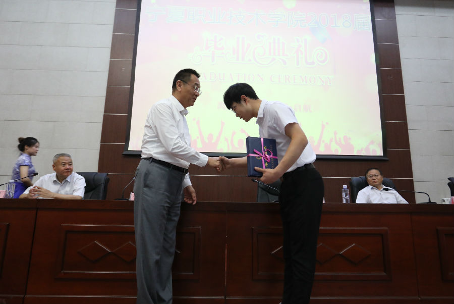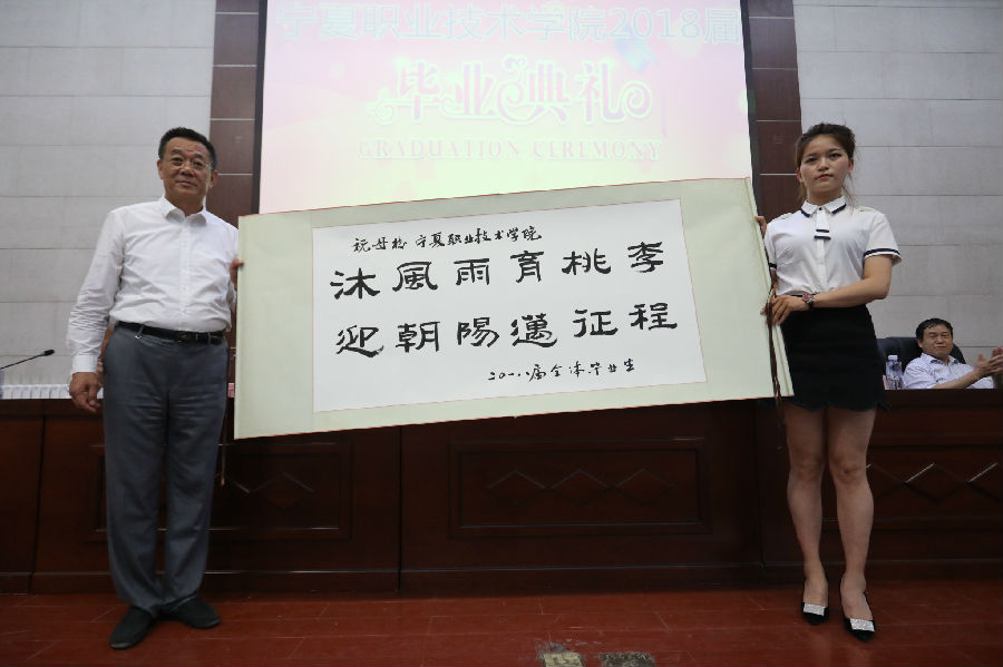 董事长马希荣指出,今年的毕业典礼非常特殊,不仅有1981名中国毕业生,还有首届38名阿曼职工毕业生。在过去的几年里,同学们一起享受着宁职新校区的优美环境,以极大的热情投入到学校教学改革、阳光校园建设、高职院校人才培养水平评估、国家优质校建设等活动中,特别是亲历了国家首批现代学徒制试点单位、宁夏高职首个“士官班”、高职职工教育等一批特色优势工作落地学校,见证了学校的长足发展,也感受到了学校日益增强的社会影响力和美誉度,更是学校深化产教融合、大力开展创新创业教育、不断拓宽国际交流与合作的最大受益者。他寄语青年学子:第一,期望同学们始终牢记,走出校园之后不论身份有了什么样的变化,都要坚持做一个善良而感恩的人。第二,期望同学们始终牢记,走出校园之后不论身在何处,都要坚持做一个自信而遵规守纪的人。第三,期望同学们始终牢记,走出校园之后不论从事的是什么工作,都要坚持做一个谦虚而好学的人。第四,期望同学们始终牢记,走出校园之后不论身处怎样的环境,都要坚持做一个有梦想而宽容的人。最后,马希荣董事长希望同学们做一个理想坚定,信念执着,不怕困难,勇于开拓,顽强拼搏,永不气馁的宁职人;做一个心怀梦想,心存坚守,心有感恩,心系国家的宁职人。他表示,学校也将会加倍努力,以更加开放的办学姿态,更加丰富多层次的教育体系,成为广大员工继续进修深造的加油站。