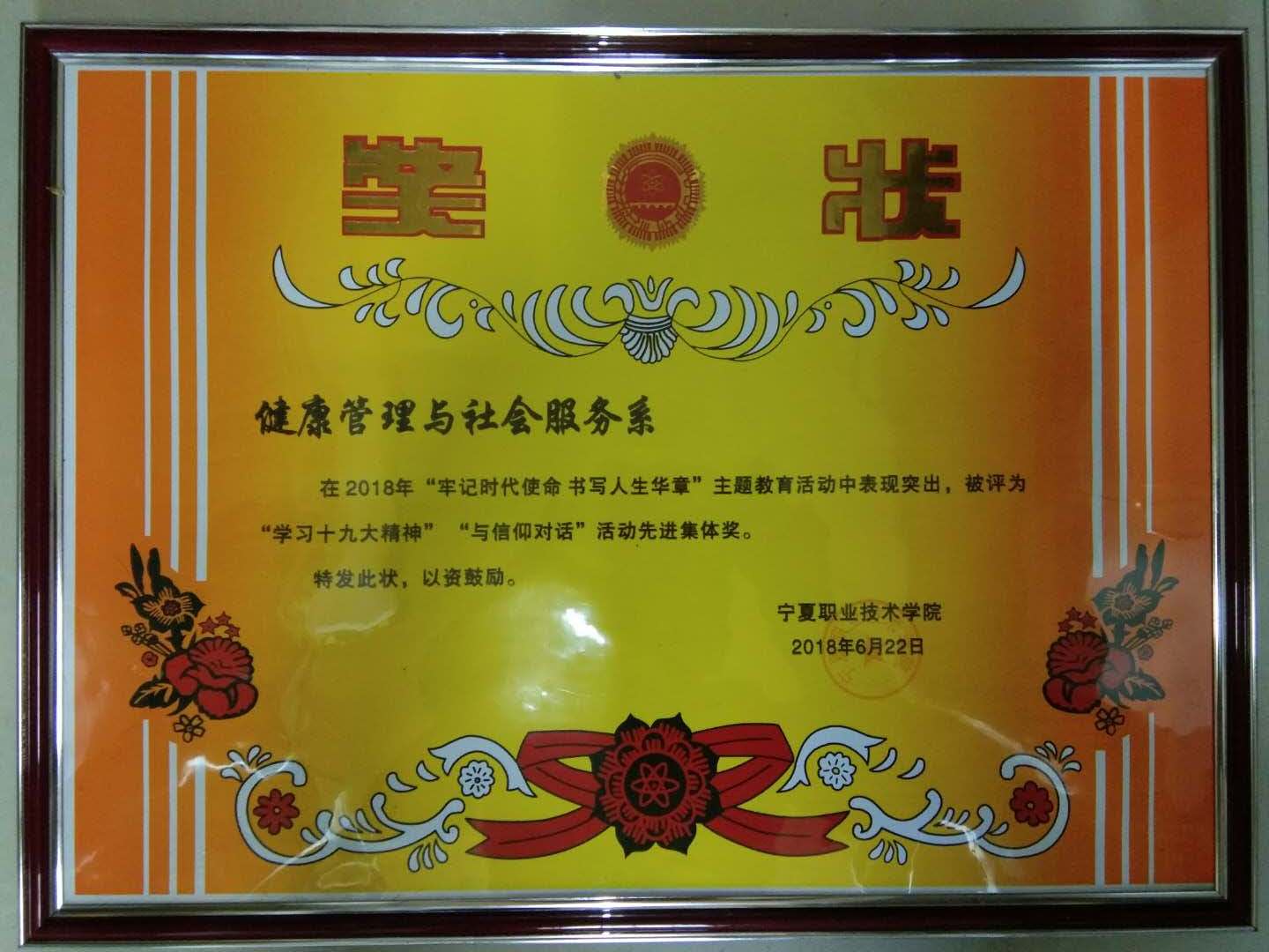 在学校举办的“牢记时代使命,书写人生华章”主题教育活动表彰大会中我系被评为“‘学习党的十九大精神’,‘与信仰对话’活动先进集体”;2017级健康管理班李文心同学,2017级老年服务与管理班郝宁花同学荣获“文明之星”; 2017级健康管理班1406宿舍荣获“文明宿舍”;2017级健康管理班杨莹莹同学荣获“传承之星”。