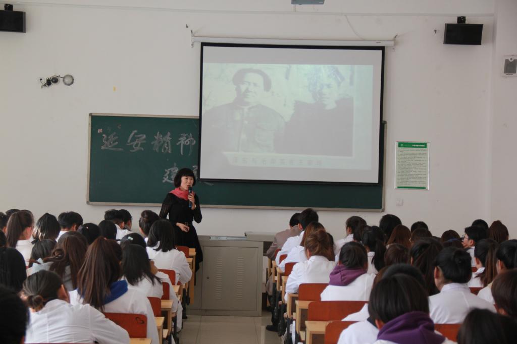 “心口呀莫要这么厉害地跳,灰尘呀莫把我眼睛挡住了……千声万声呼唤你——母亲延安就在这里!”系党支部书记于兰以贺敬之的《回延安》朗诵开始,分享了她在延安学习之行的感想。从毛主席在王家坪与儿子毛岸英的合影照,到习近平总书记回梁家河看望乡亲父老,绘声绘色的讲解了革命圣地的故事。数次眼眶红润以致停讲,掌声一次次的响起,参会同志和同学都深深的被这种精神所感染。延安精神既包括了实事求是、理论联系实际、全心全意为人民服务和自力更生艰苦奋斗,还蕴含着着创新、开拓进取的精神。结合系党支部工作实际,于兰要求教师要做“四有”好教师,即要有仁爱之心、有理想信念、有道德情操、有扎实学识。员工要做德智体美劳全面发展的“三好、四美”好员工,即身体好、学习好、工作好和仪容美、仪表美、行为美、心灵美。以延安精神为引领,努力做好党建和专业建设工作。努力将系部 “承传国粹、健康报国、孝亲尊师、精术济人” 专业理念融入思想、渗透到行动中去。专业教师代表和员工代表纷纷发言谈自己受到的教育和感想。