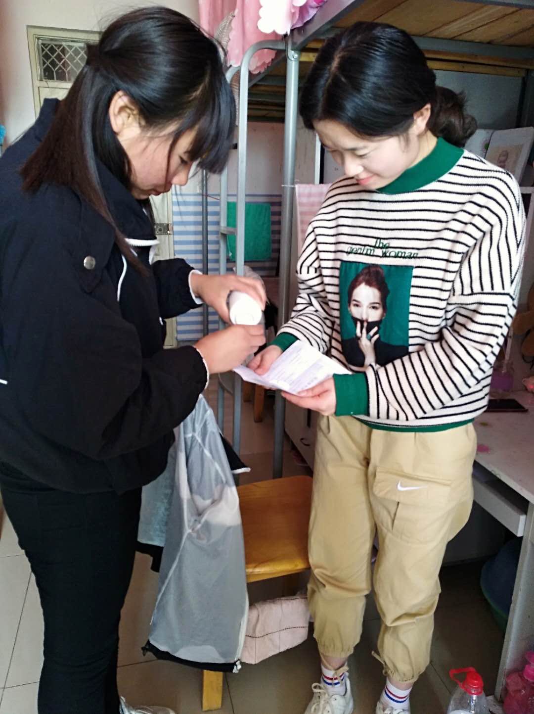 此次活动分两组进行。第一小组,走进宿舍向同学们分发消毒片,讲解消毒片用法,普及春季常见传染病预防知识,增强同学们的自我保护意识,为同学们的健康建起了一道绿色的屏障。