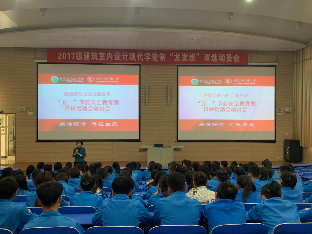 4月26日下午,健康管理与社会服务系在竞智楼二楼阶梯教室召开“五一”节前安全教育暨田径运动会动员大会。参加此次会议的有我系党支部书记于兰、辅导员及全体在校生。