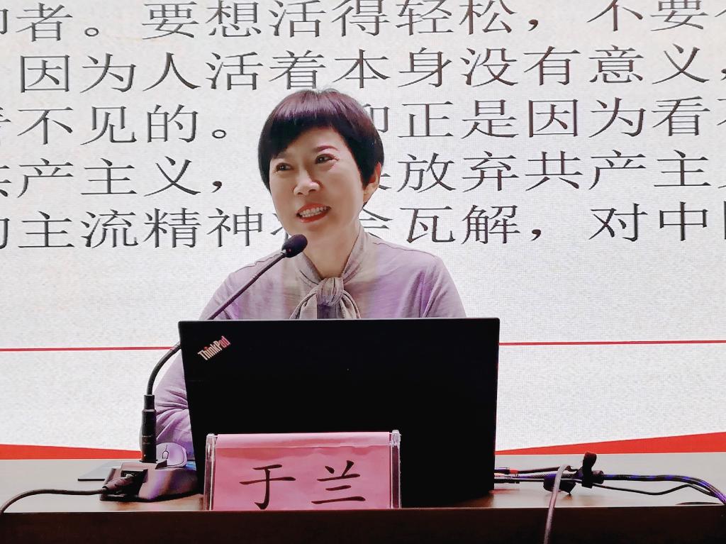于兰书记首先讲解了理想、信念与初心的关系,播放了《习近平不忘初心、牢记使命摘编》中“如何理解新时代中国共产党的历史使命”小视频。她强调,理想是对目标追求的渴望度、信念是对理想、目标实现的信心,而信仰是对某种价值目标的敬仰和追求,是支撑实现理想和目标的精神力量。理想决定方向、信仰决定选择。