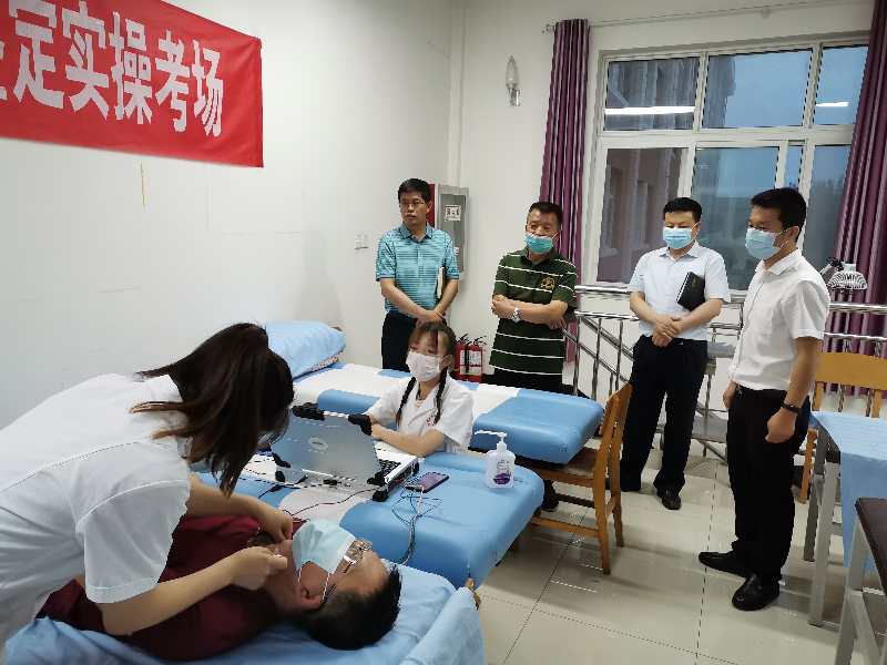 赵利宁书记带领相关部门同志来到创业街健康管理专业实训基地,与正在练习的同学们亲切交流。赵利宁书记详细询问了同学们学了哪些专业课程,正在训练什么技术,并坐在椅子上体验同学们的推拿手法。体验时,赵书记勉励同学们加强练习、提高技能,为师生更好地服务。党政办公室主任任全录对创业街艾灸理疗仪、远红外经络治疗仪等设备调研,询问了具体功能和实际效果,随行其他同志还体验了无创血液分析设备对人体常见血液指标的检测。