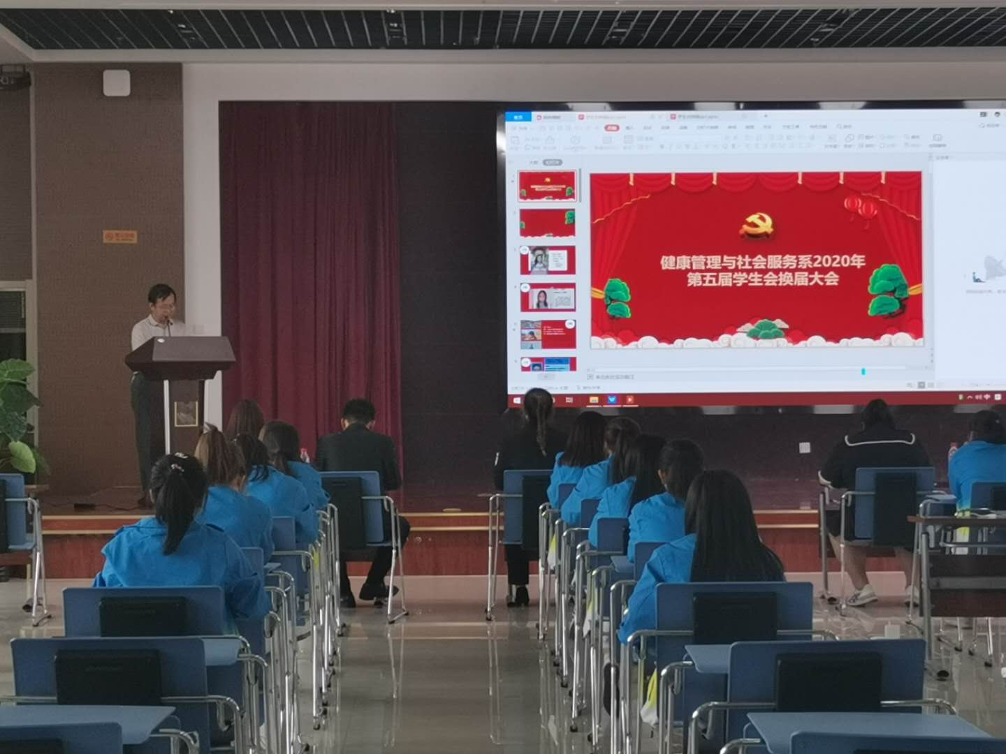 会议结束后,接着举行了健康管理与社会服务系2020年第五届员工会换届大会,会议由王倩老师主持。出席此次换届大会的评委有党支部副书记俞莹磊,吴婧雨老师,第四届员工会主席彭佩茹,王云飞等。首先王倩老师对换届规则进行了安排,随后是员工会主席彭佩茹发言,她对大一员工会成员的工作以及上一届员工会成员在员工会的经历进行了总结,并表示在接下来的一年中,在这个大家庭里,会努力做好自己应尽的责任,不松懈,让健康管理与社会服务系的员工会向前迈进一大步。