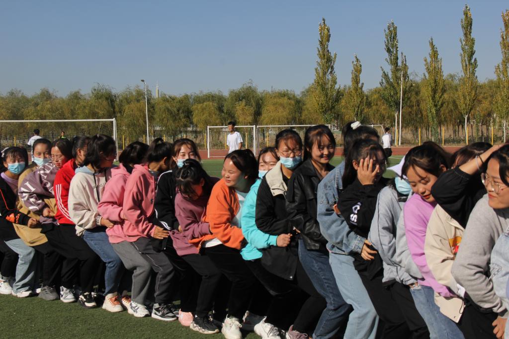 活动现场气氛热烈,欢声笑语不断,整个拓展活动共有热身、班级同心圆等5个环节,同学们精神抖擞、团结协作,活动的高潮是“匠心筑梦、同心报国”伊丽莎白圈,同学们整齐的排成一个圈,积极配合主持人的号令,整齐划一,将自己在团队中的位置调整好,“坐”主持人一声令下,256名新生同时向后坐,前后相撑,团结信任,成功的完成这项挑战。