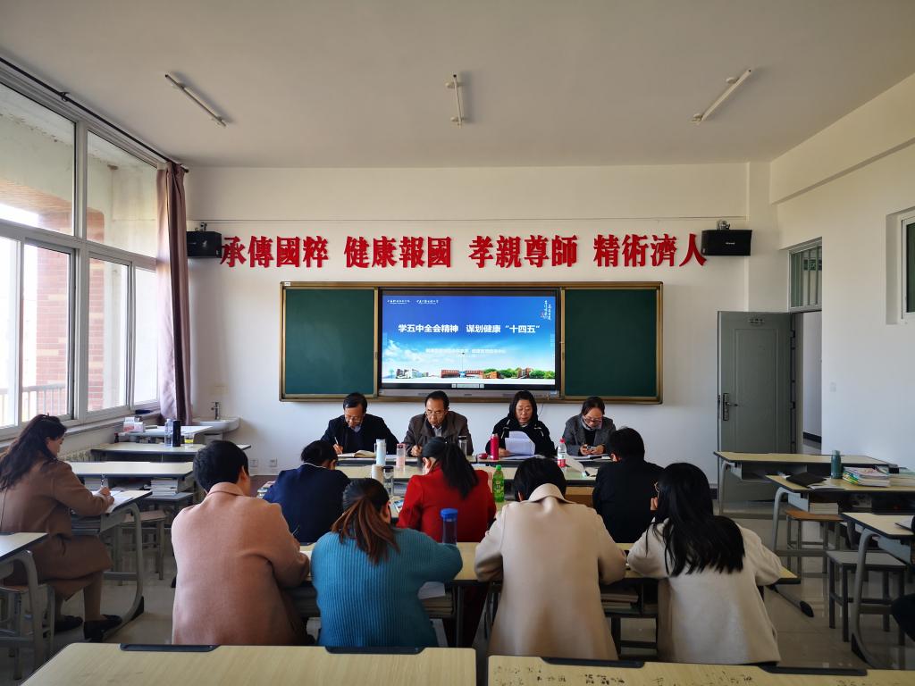 会议传达学习了《中国共产党第十九届中央委员会第五次全体会议公报》、宁夏回族自治区党委常委会扩大会议精神和集团专题学习党的十九届五中全会会议精神。会议要求全体师生要认真学习五中全会精神,深刻领会五中全会丰富内涵,在学懂、弄通、做实上下功夫,要紧紧围绕“三全育人”“四史教育”等重点工作,秉成“承传国粹,健康报国,孝亲尊师,精术济人”系部理念,为“全面推进健康中国建设、实施积极应对人口老龄化国家战略作出应有贡献。