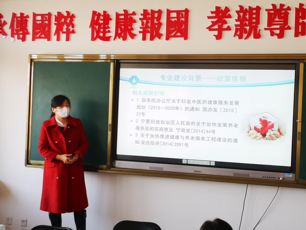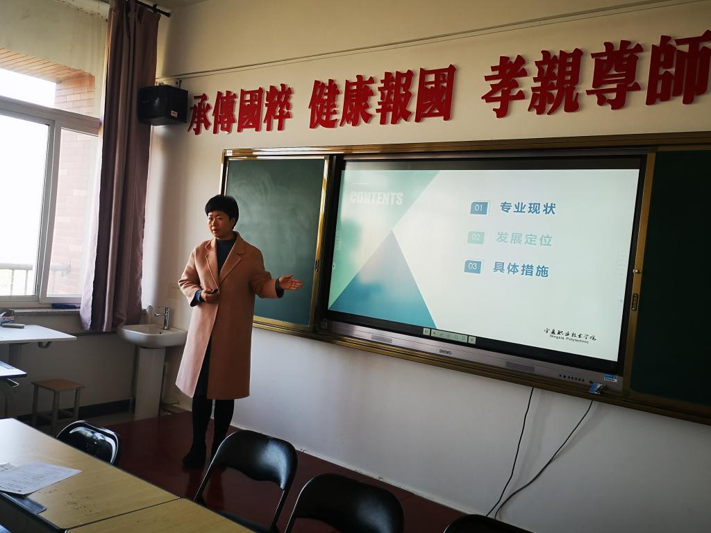 幼儿发展与健康管理教研室主任王雪妮老师介绍了专业建设的背景政策、人才培养目标、发展定位以及团队团队建设,提出未来专业建设要依托反射疗法这一核心,加强“三教”改革,促进专业发展。