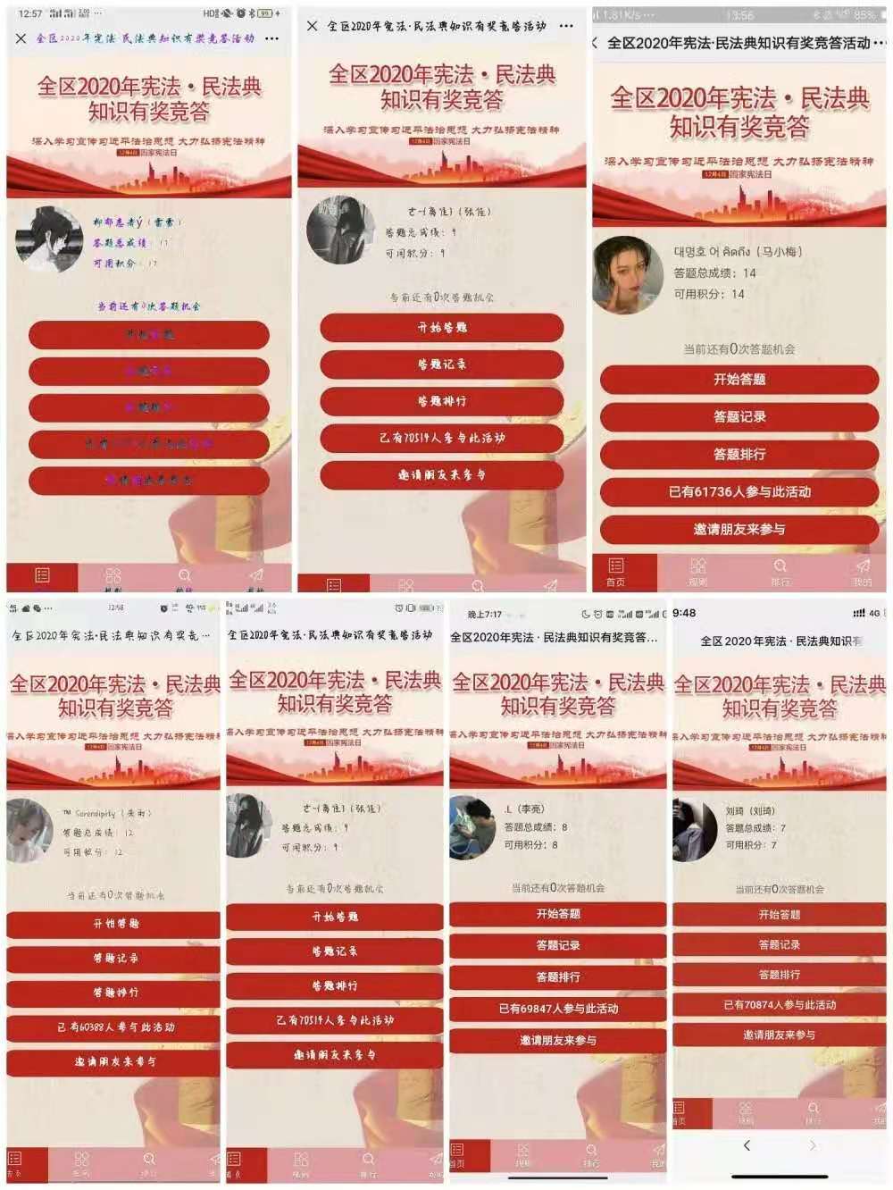 本次答题采取积分累计的规则。在刚开始答题的时候,由于一些同学法律知识薄弱,虽然每位同学每天有五次答题机会,但是得到的积分数并不高,但是每次答题后,同学们都会通过网络对本次答题进行一个梳理和反思,学习相关题目的知识,所以在以后的答题过程中,大家的分数都在逐渐提高。