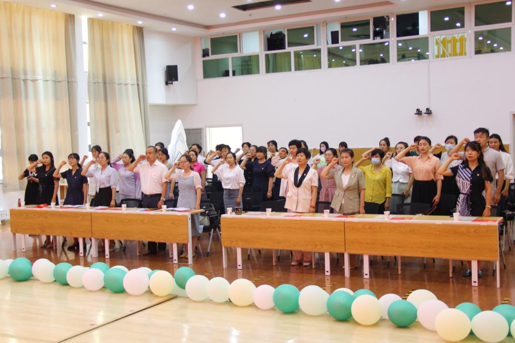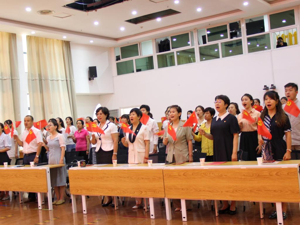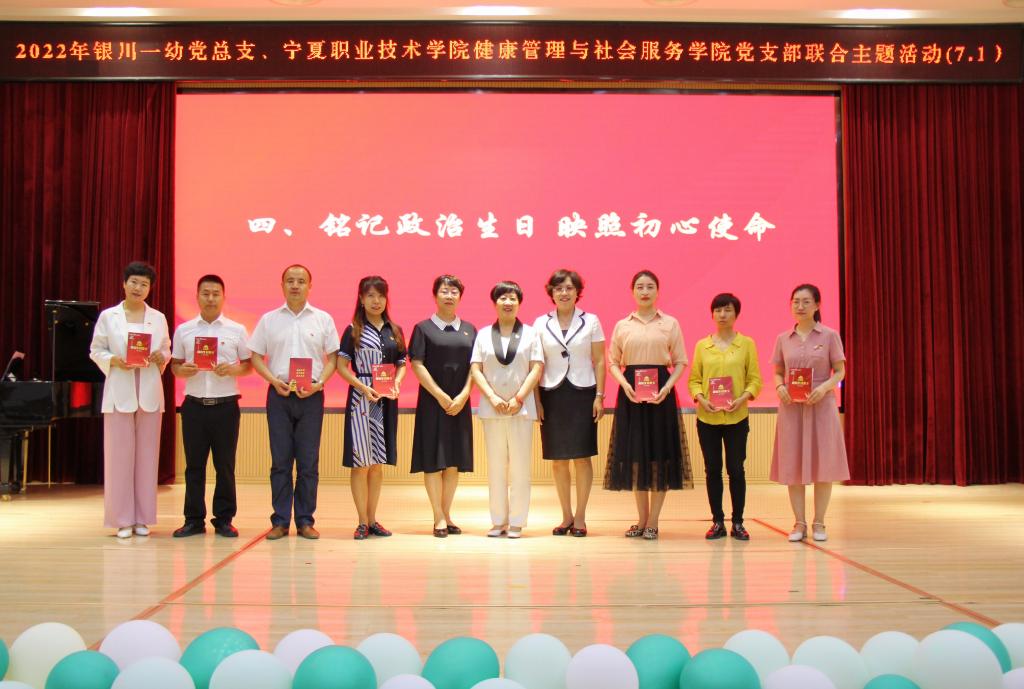 面对鲜红的党旗,健康管理与社会服务公司党支部书记于华和银川一幼党总支书记张欣带领在场的全体党员重温入党誓词,用诚挚的誓言表达对党的忠诚和永不叛党的坚强决心。