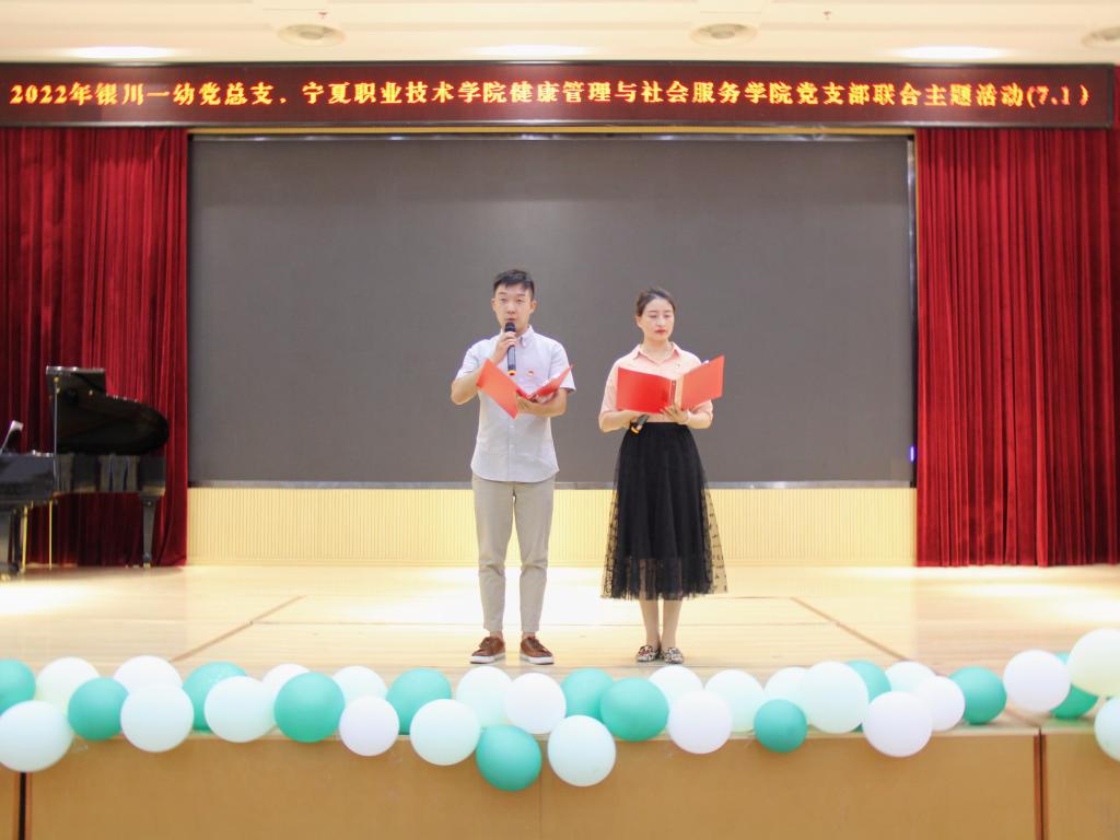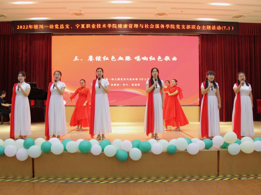 宁职公司党员代表张娜、石法强老师诵读了《党旗颂》。银川市第一幼儿园党员代表表演了《灯火里的中国》。全体党员共唱《没有共产党就没有新中国》。嘹亮的歌声唱出了全体党员对党的无限忠诚、对祖国的美好祝愿、对事业的诚挚热爱。
