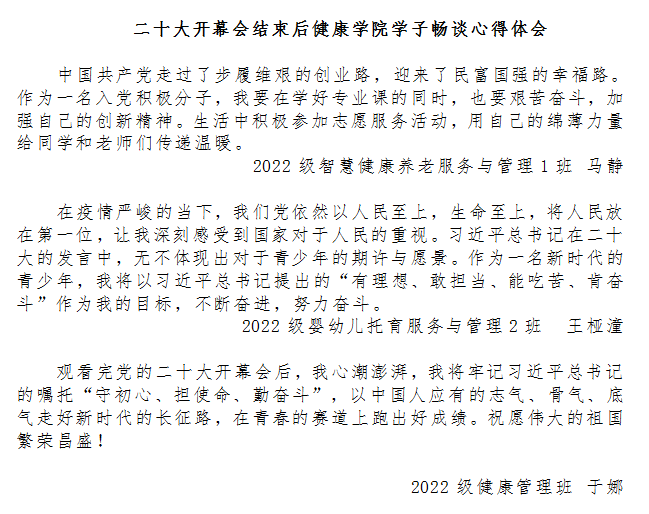一百零一载风雨同舟,众志成城坚定不移;七十三年披荆斩棘,继往开来不忘初心。忆往昔峥嵘岁月,改革开放四十四载彪炳史册,看今朝扬帆起航,中国梦圆二百年功耀千秋。作为新时代青年的我们深刻领会到二十大召开的政治意义、历史意义和实践意义。我们要坚持马克思主义立场观点方法,从实际出发,做到理论上清醒,政治上坚定,在学思践悟中牢记初心使命,在细照笃行中不断修炼自我,知行合一。衷心祝愿党的二十大胜利召开,祝祖国母亲繁荣富强!