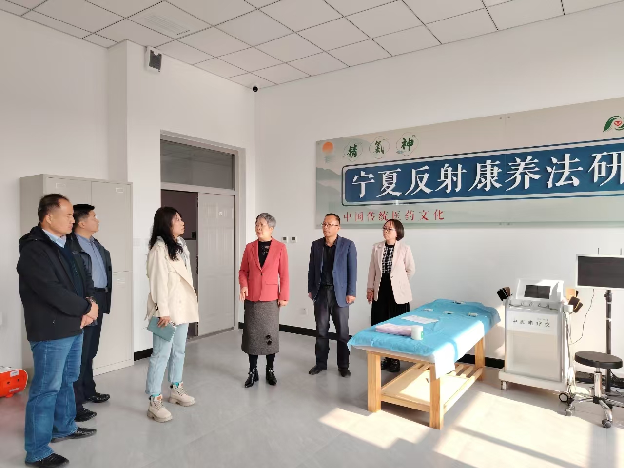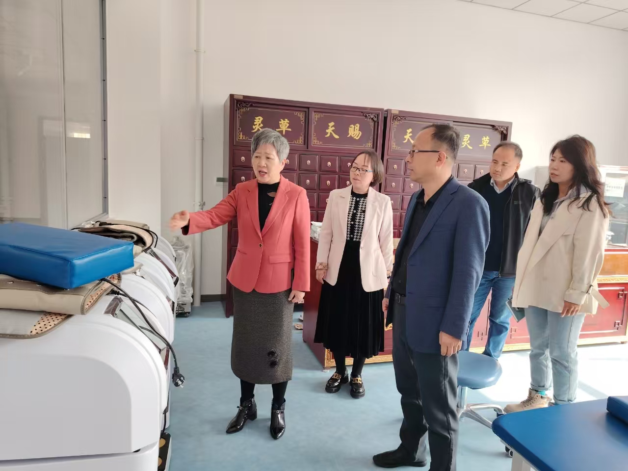 李晓延副董事长深入调研了健康养老教育实训中心一层大厅、康复实训室、中药文创实训室、反射康养法研究院、党建与员工活动阵地、幼儿照护实训室、老年照护实训室及导医台等功能区建设与使用情况,后到会议室听取学院班子成员汇报工作并作指导。