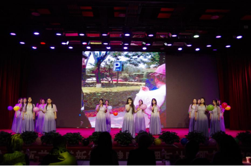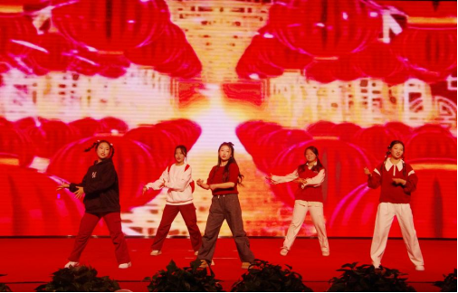 表彰环节结束后,文艺汇演正式开始。开场舞《桃花朵朵开》由24级婴幼儿托育服务与管理2班和员工办公室的辅导员们联合呈现,演员们活力四射,迅速点燃了现场的气氛。