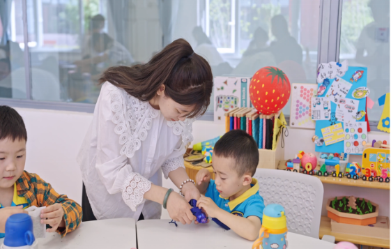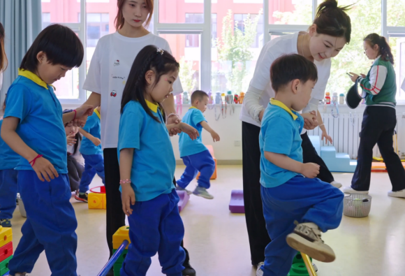 孝心手作活动以端午传统节日为切入点,托育专业员工带领幼儿化身“小小传承人”,用新鲜艾草、彩布制作艾草暖心包。小儿推拿体验区里,托育专业教师带领员工团队以穴位娃娃偶为教具,为幼儿分步演示捏脊、揉腹、按揉足三里等基础手法。在感统训练室里,幼儿们依次踏上平衡木,小心翼翼地挪动脚步,锻炼自身平衡能力;两人一组,手持触觉球轻轻互揉后背,感受粗糙、柔软等不同材质带来的奇妙触感。