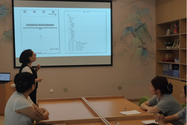 为做好学院前期团体标准的推广应用,推动养老服务规范化,左莹以《社区居家养老园艺疗法服务规范》为核心,为养老中心员工开展标准的推广培训,涵盖理论基础、操作流程和安全规范,通过不同园艺疗法活动载体的应用、情景模拟等帮助员工掌握园艺疗法科学规范的服务过程。养老中心周敏经理表示,标准化培训提升了团队专业素养,未来会将园艺疗法融入老年服务,打造绿色、优质的康养服务品牌。
