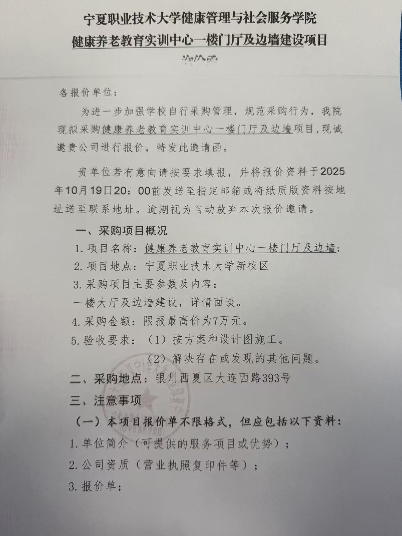 世界杯8833300足球 健康养老教育实训中心一楼门厅及边墙建设项目 询价函