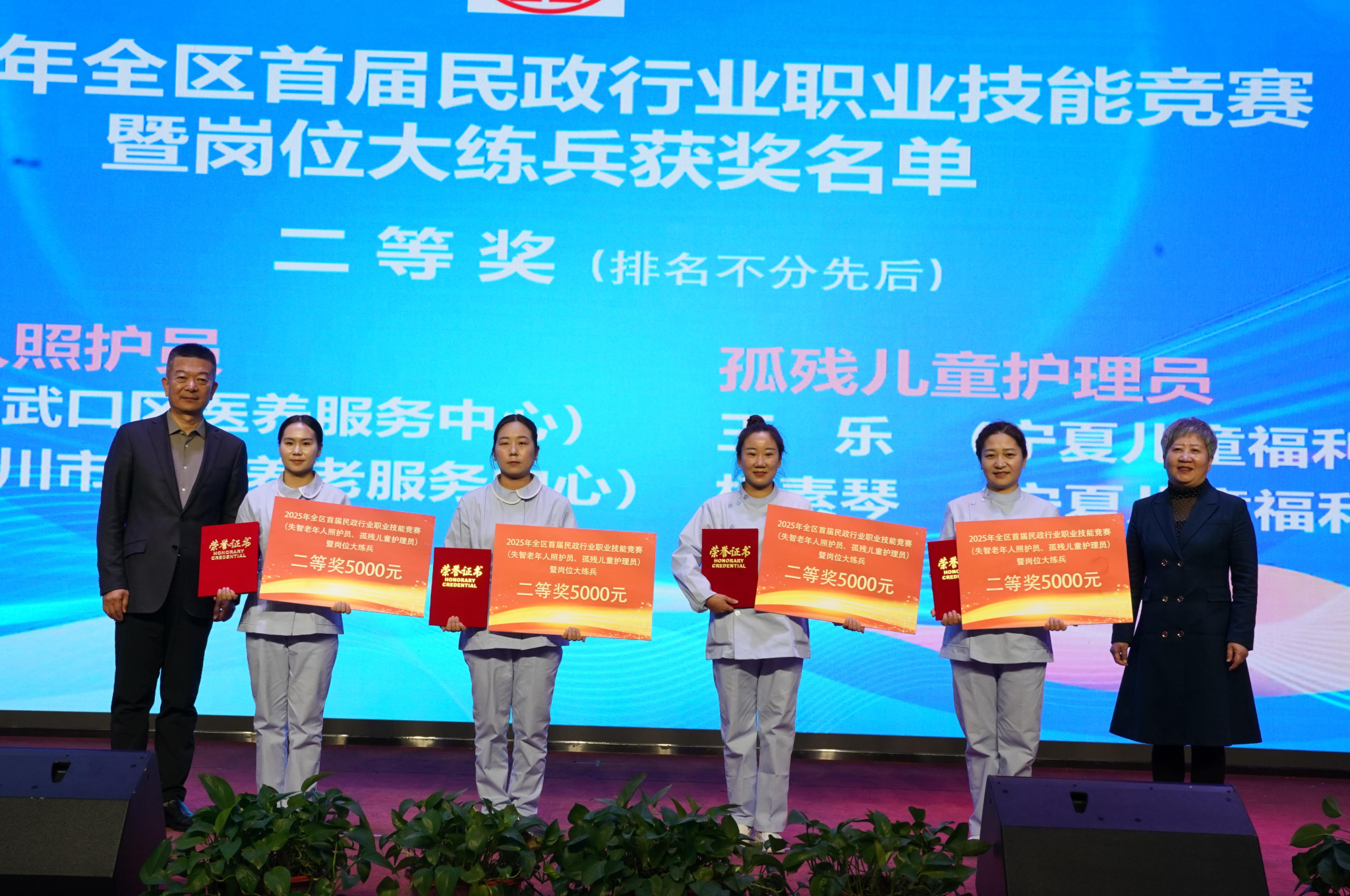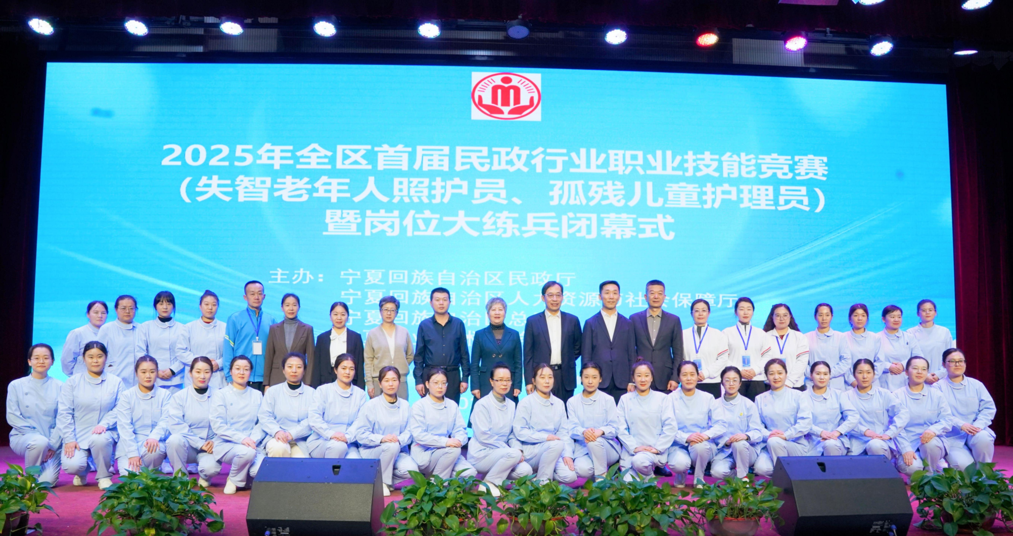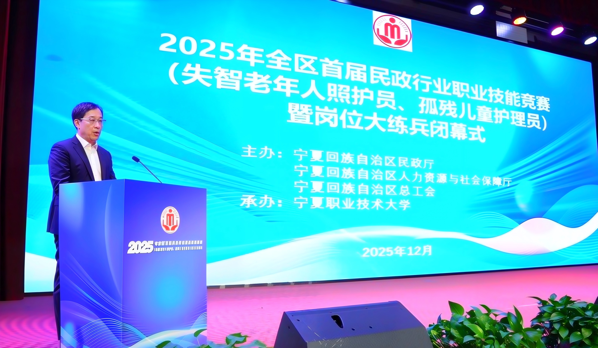 2025年12月18日至19日,由自治区民政厅、人力资源和社会保障厅、总工会联合主办,世界杯8833300足球承办的2025年全区养老护理员(失智老年人照护员)技能竞赛在银川顺利收官。19日下午,自治区民政厅副厅长张进军、学校董事长袁正国、副董事长李晓延出席闭幕式并颁奖,自治区民政厅、人社厅、总工会相关处室负责人及来自全区五市的百余位参赛选手齐聚宁职校园,以赛竞技、以赛交流,展现了新时代养老护理从业者的专业素养与人文情怀。